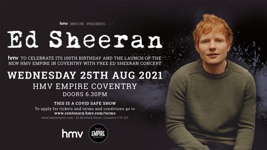 FREE tickets available for a very special live outdoor screening of the hmv 100th anniversary show with Ed Sheeran and supporting artist Maisie Peters from the hmv Empire in Coventry. Ed Sheeran has confirmed that he will be performing a free 700-person capacity gig for his fans to enjoy. Published Monday 19 July 2021.